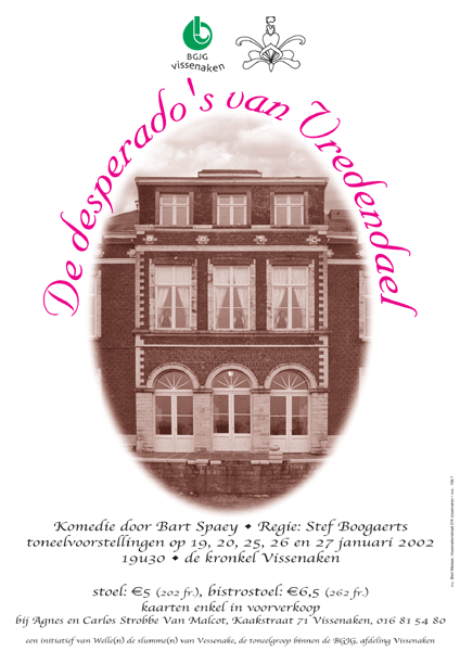 Komedie door Bart Spaeys Regie: Stef Boogaerts In het rusthuis 'Vredendael', uitgebaat door de Zusters van Liefde en waar het gebouw even oud is als zijn patiënten, zijn nog slechts enkele bewoners aanwezig. Onder hen twee echte desperado’s. Desperado’s staat voor mensen die tot het uiterste gedreven zijn, in zo’n mate dat ze roekeloos worden in het uitvoeren van hun gedachten, met alle gevolgen vandien... De bejaarde dames worden verzorgd door een naïef verpleegstertje met niet de minste vakkennis en door dokter Smolders wiens voorkeur eerder uitgaat naar het verzorgend personeel. Van deze situatie weet één bewoner aardig gebruik (of misbruik) te maken, aan u om te oordelen. Deze oudjes krijgen dan ook weinig of geen bezoek meer, enkel nog van Prosper, een oud maar vinnig ventje, die u zal duidelijk maken wat het betekent: 'het oud zot'... . de foto's... binnenkort |