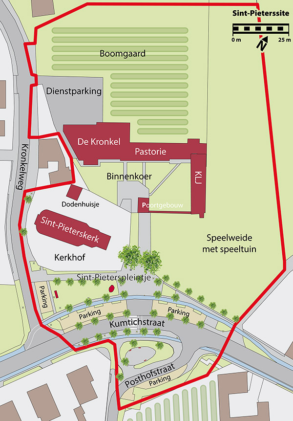de Sint-Pieterskerk inclusief het ommuurde kerkhof en het dodenhuisje